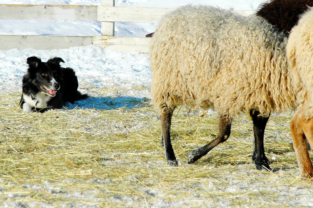 Tex has calm herding style with good skills to concentrate. He can freeze one leg up if asked. His strongest qualities are naturally wide flanks and handling a big flock. He has the same attitude when herding no matter how many animals, so it looks a bit ridiculous him flanking widely with 5 sheep like there were 500 of them…