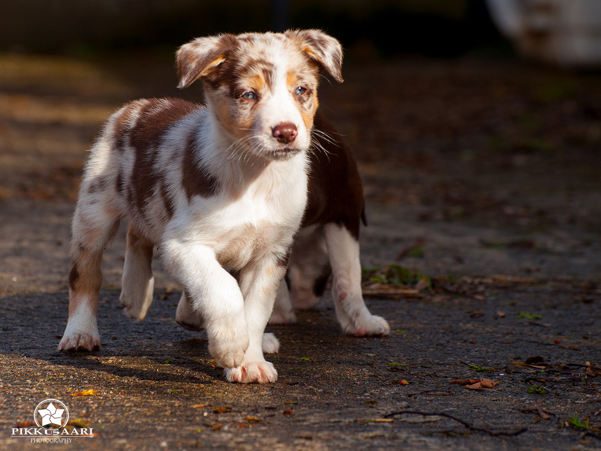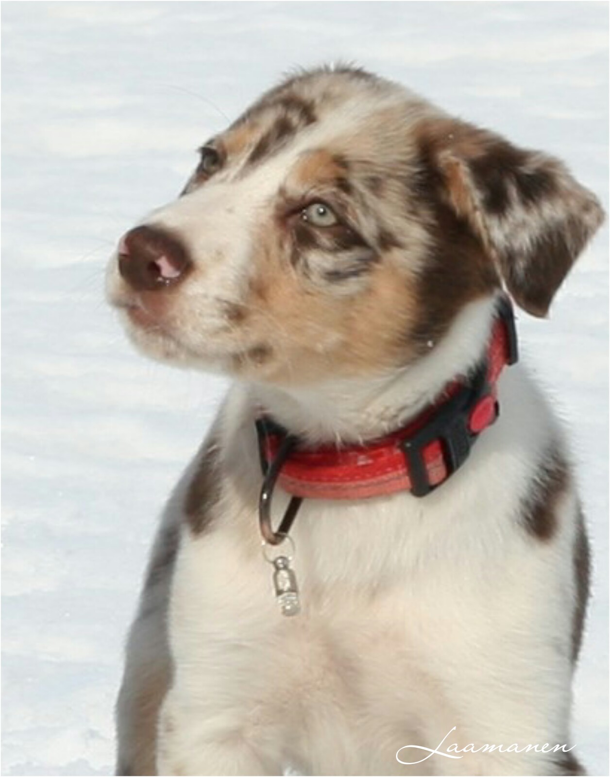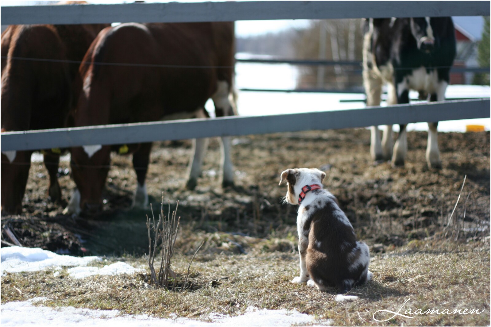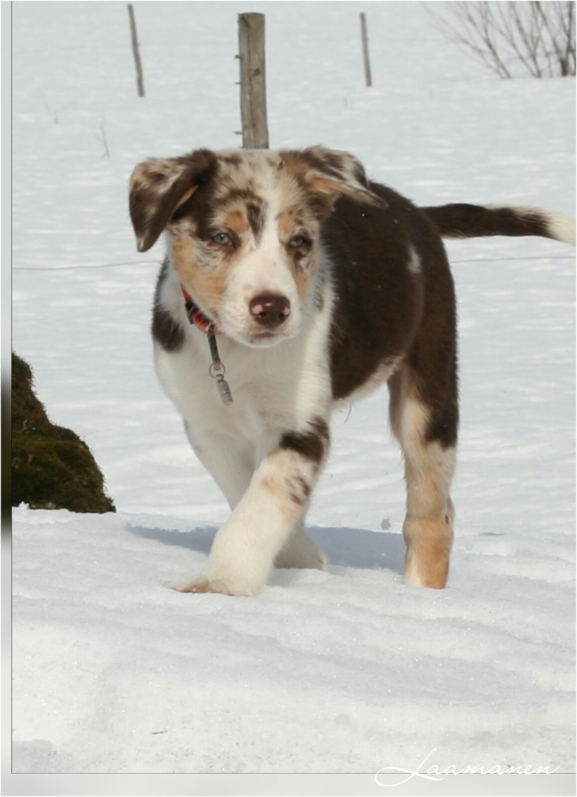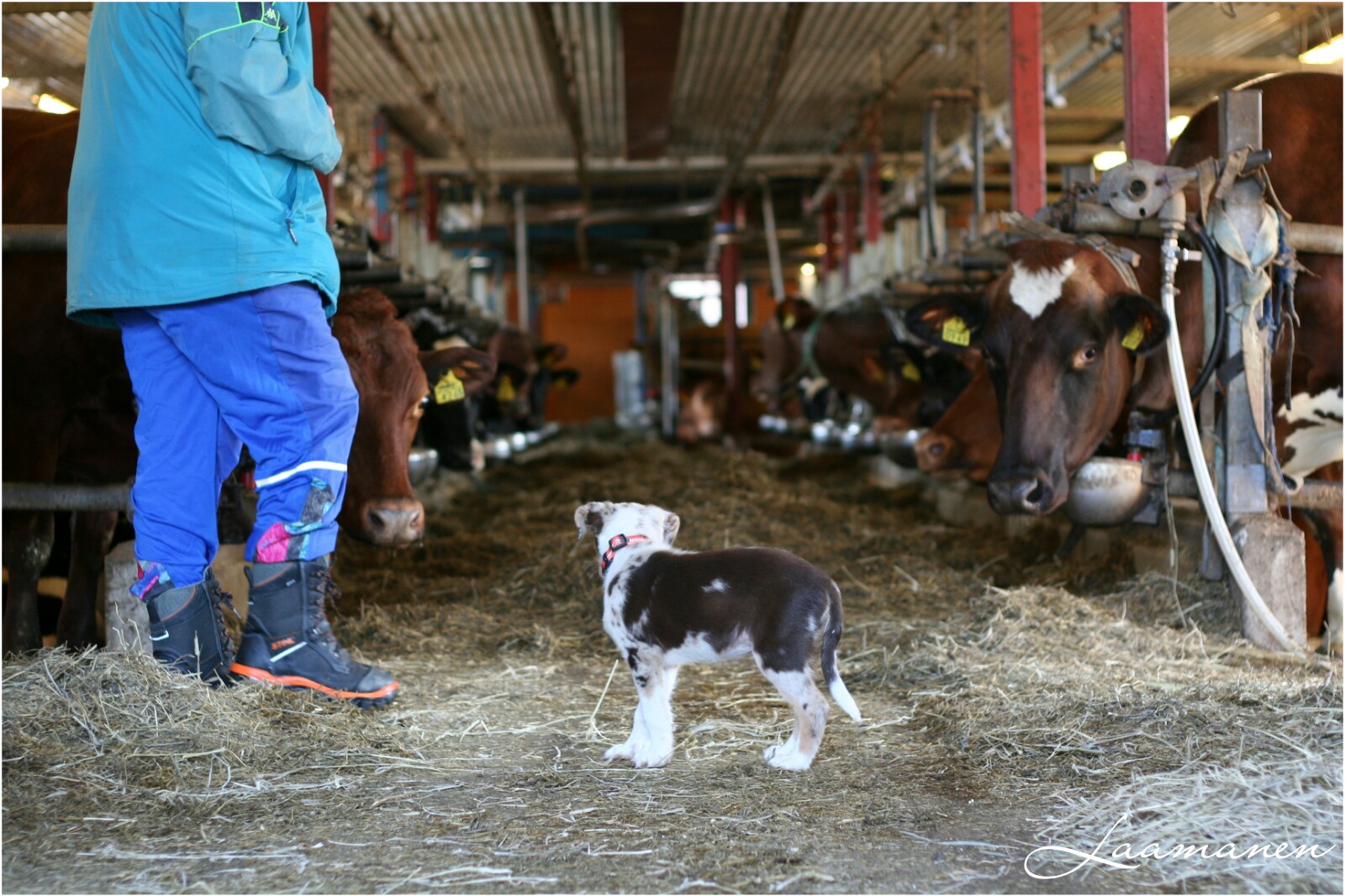 Elmo works as a farm dog in South-East Finland. This naturally calm little boy has learned the routines with cows fast, and has been allowed to move the girls on a field alredy on his first autumn. Somewhat too much speed still while working outside if he gets very excited, but Elmo is a fast learner. At home he´ s a people loving, easy family dog.