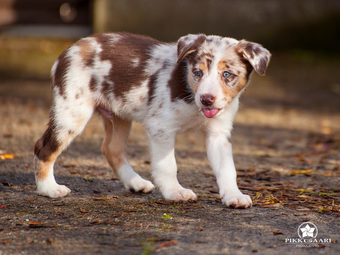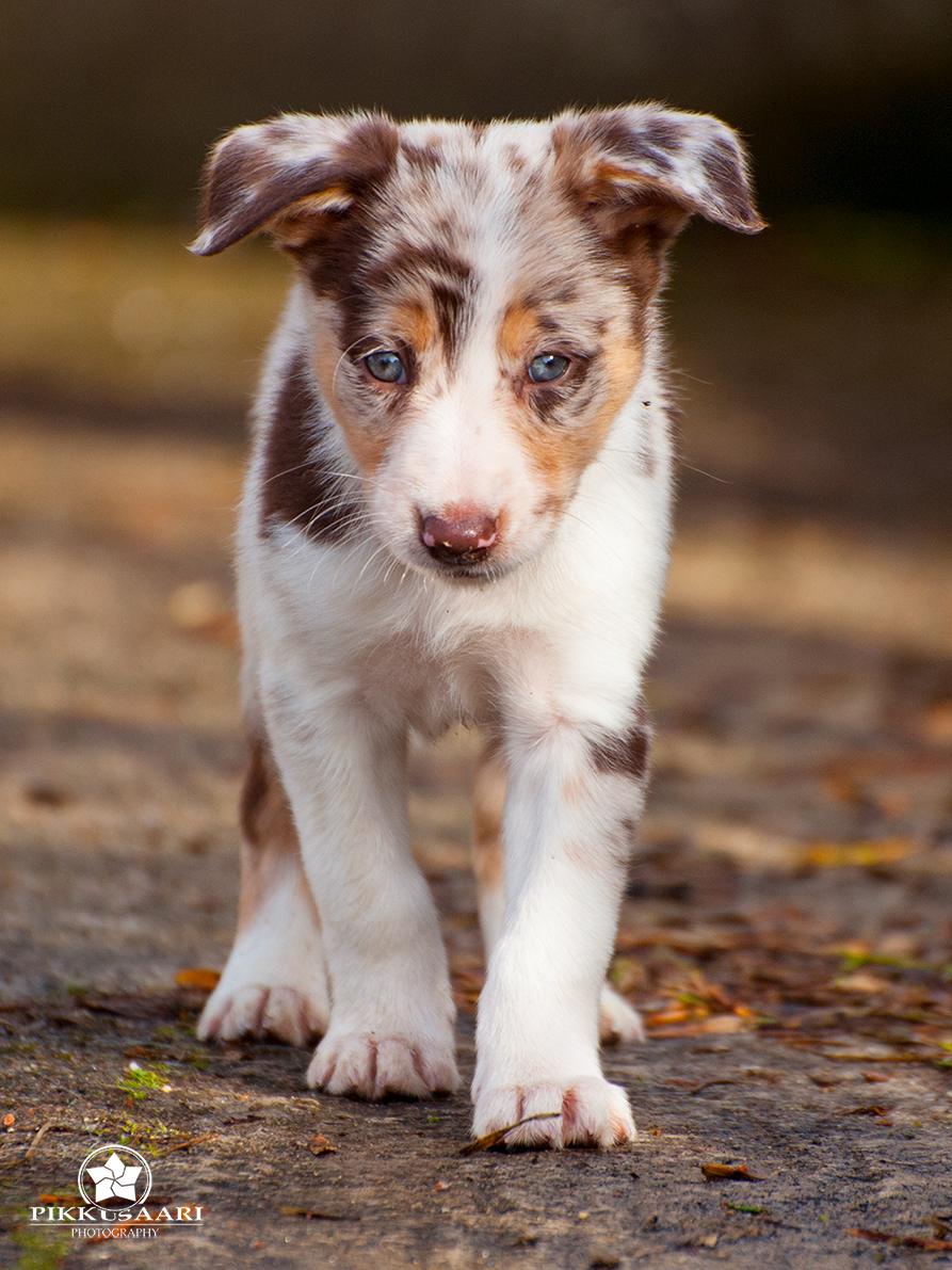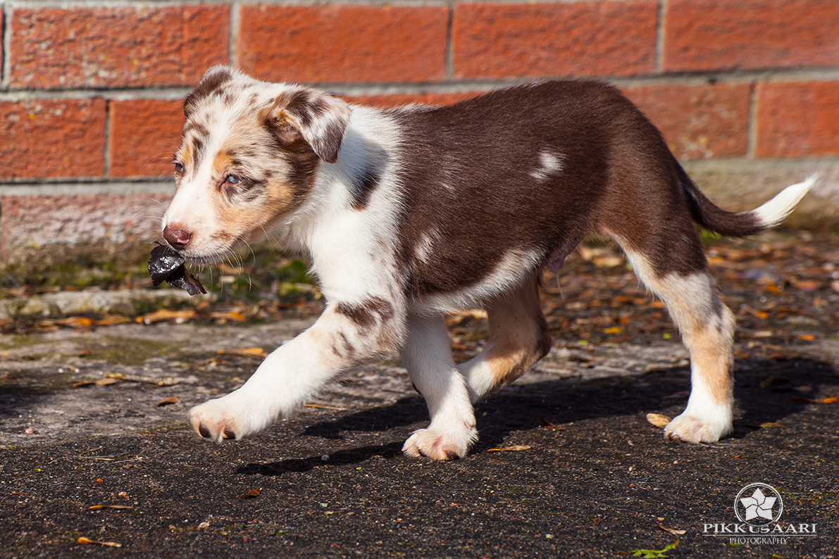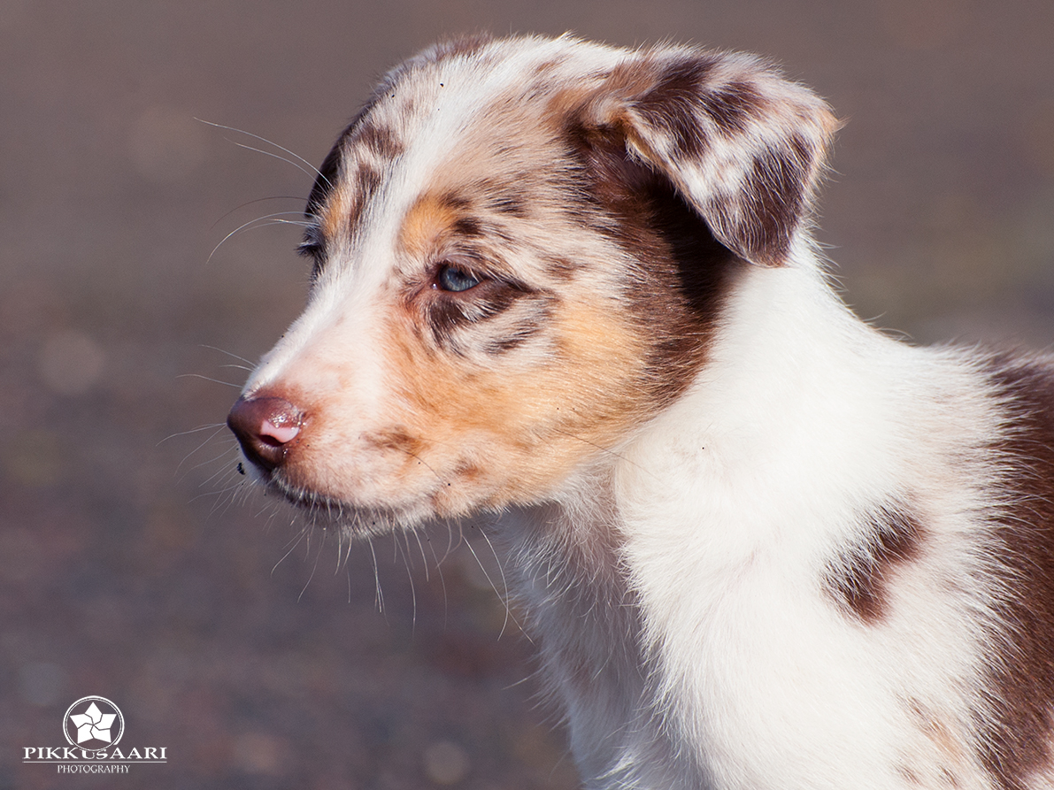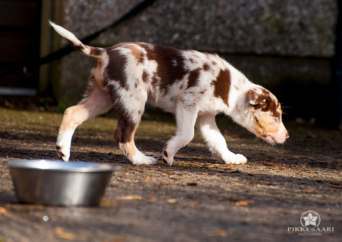 Elmo works as a farm dog in South-East Finland. This naturally calm little boy has learned the routines with cows fast, and has been allowed to move the girls on a field alredy on his first autumn. Somewhat too much speed still while working outside if he gets very excited, but Elmo is a fast learner. At home he´ s a people loving, easy family dog.