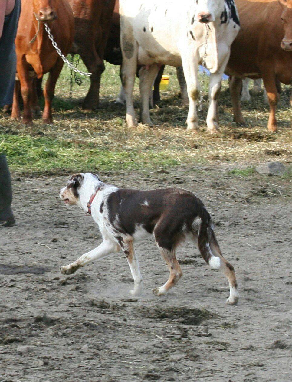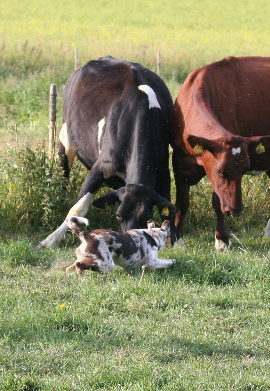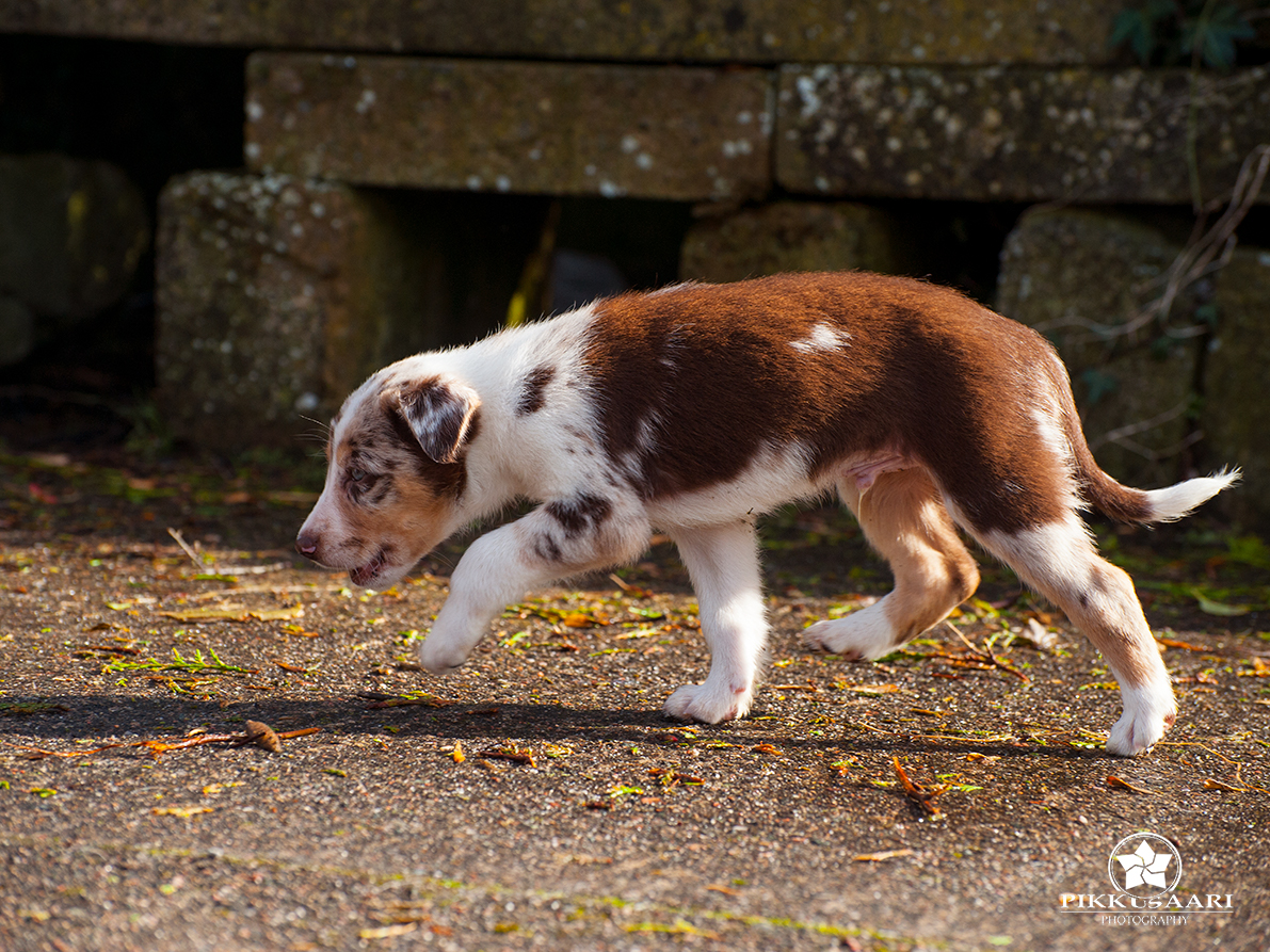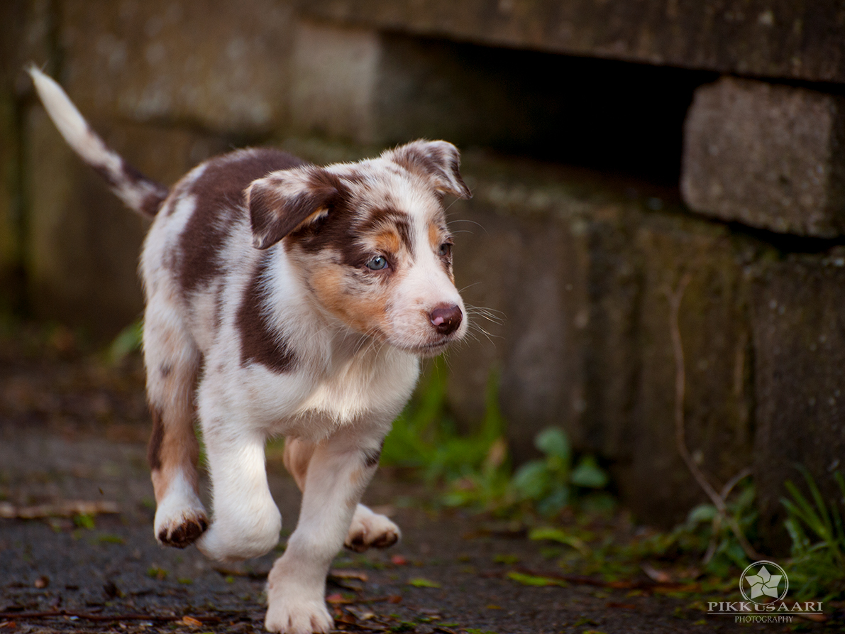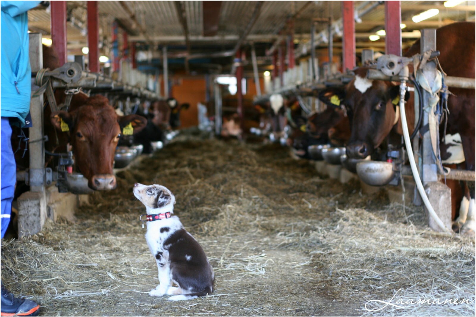 Elmo works as a farm dog in South-East Finland. This naturally calm little boy has learned the routines with cows fast, and has been allowed to move the girls on a field alredy on his first autumn. Somewhat too much speed still while working outside if he gets very excited, but Elmo is a fast learner. At home he´ s a people loving, easy family dog.