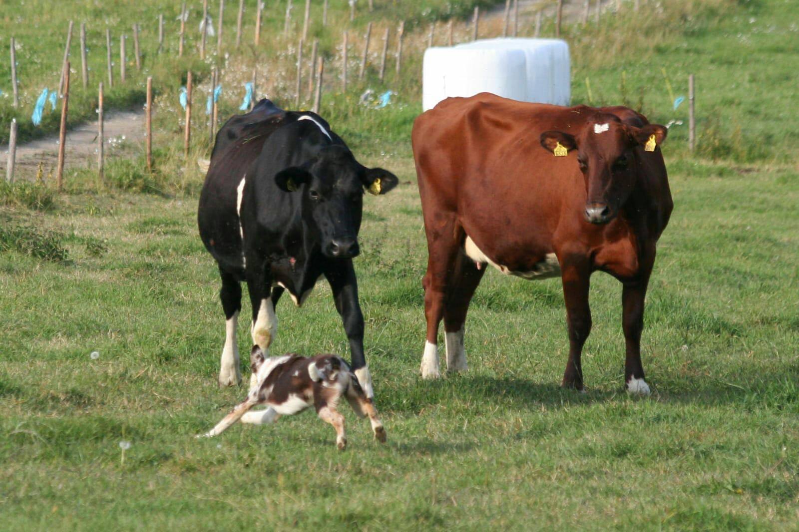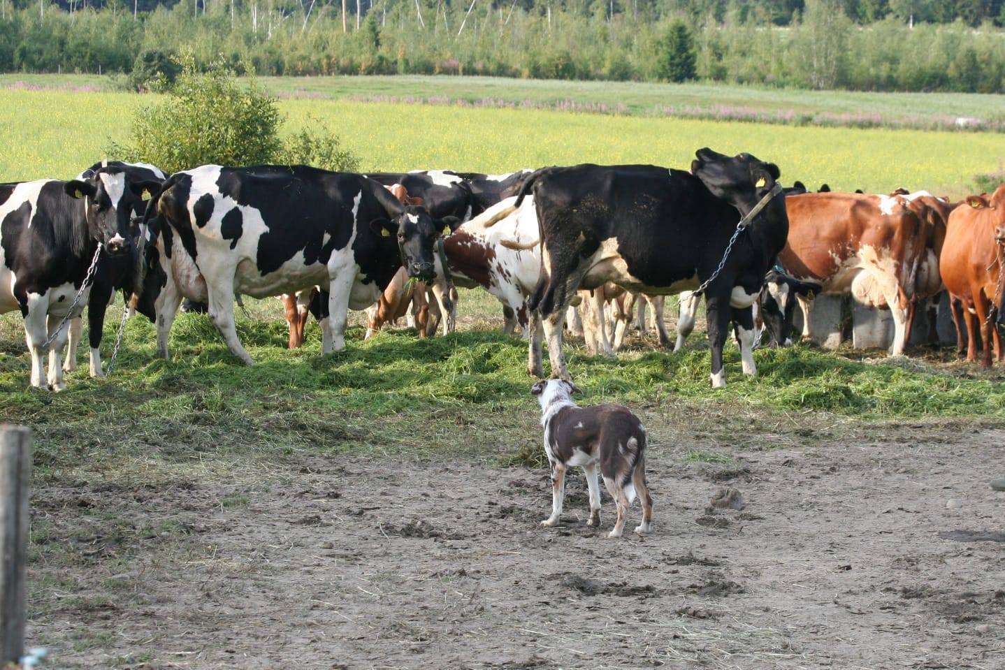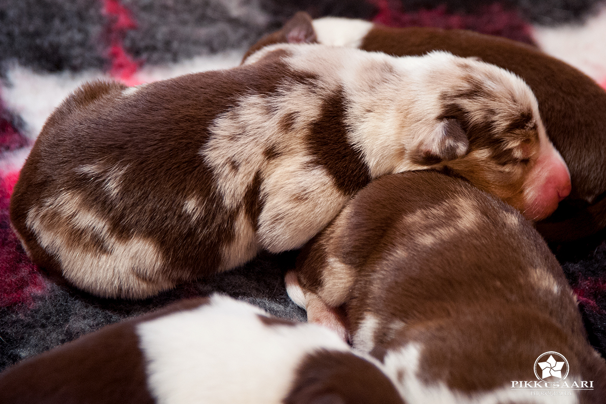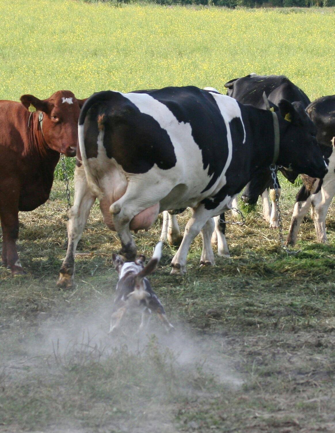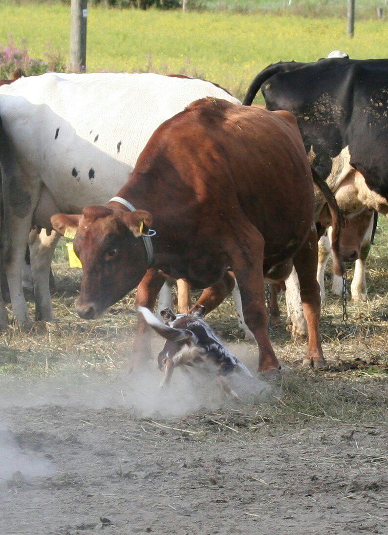 Elmo works as a farm dog in South-East Finland. This naturally calm little boy has learned the routines with cows fast, and has been allowed to move the girls on a field alredy on his first autumn. Somewhat too much speed still while working outside if he gets very excited, but Elmo is a fast learner. At home he´ s a people loving, easy family dog.
