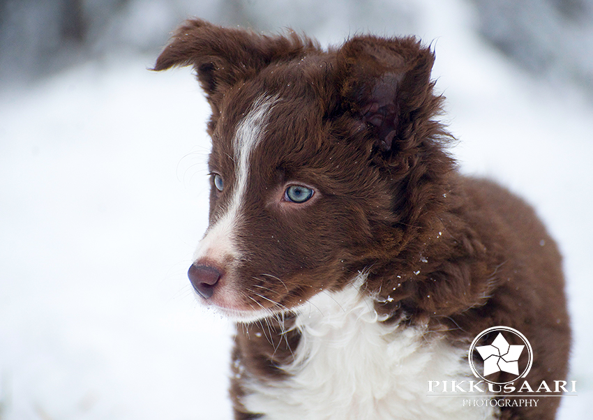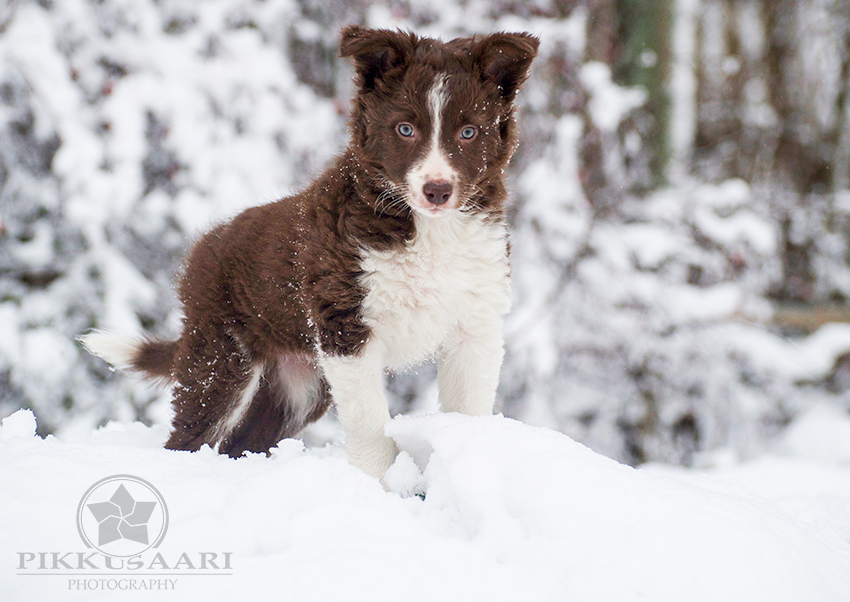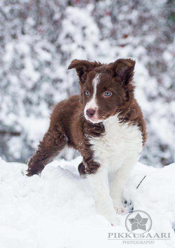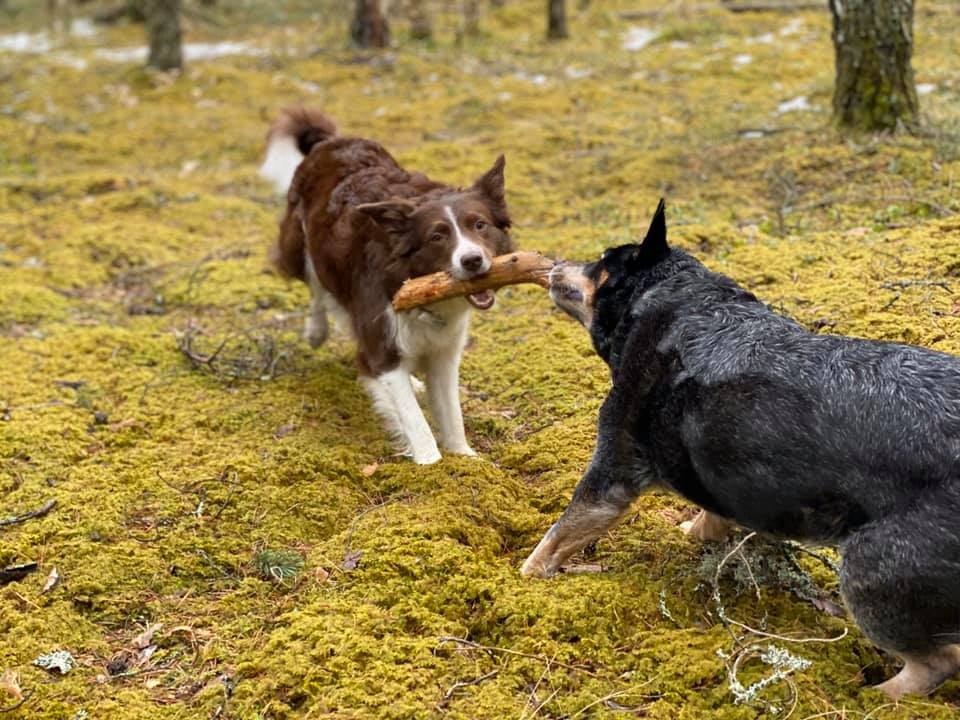 Yoko is brave and well adapting dog, also convenient to take to the office. At home she is almost ”invisible” and loves to sleep under the bed or stairs or next to a person. Yoko loves tug and ball games, carrying things and swimming. When playing tug game, she is very noisy and growling. In the woods she is always carrying a stick or a ball.
