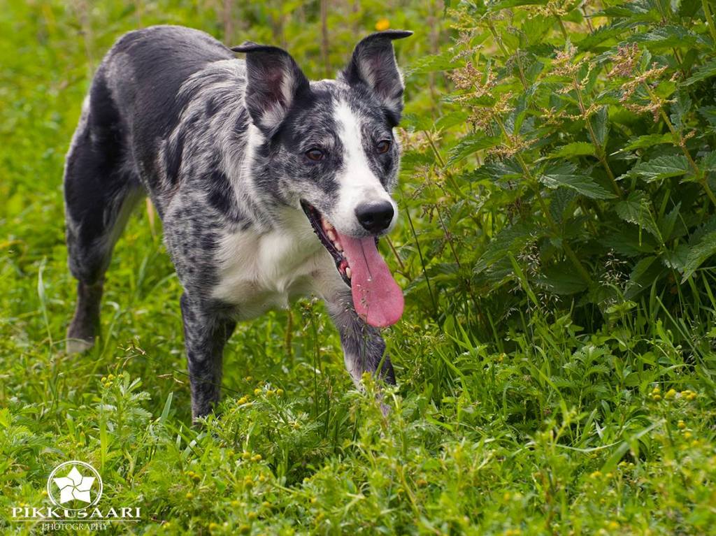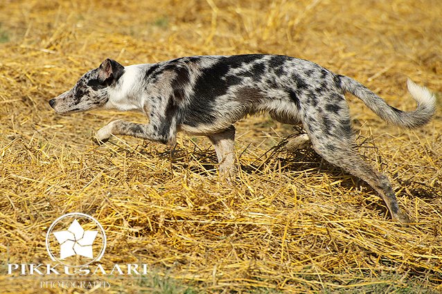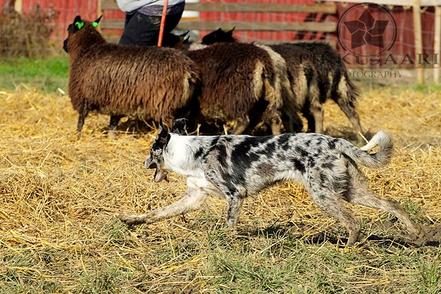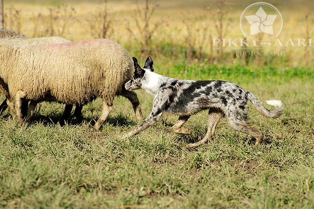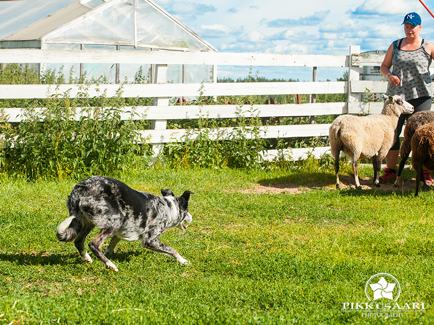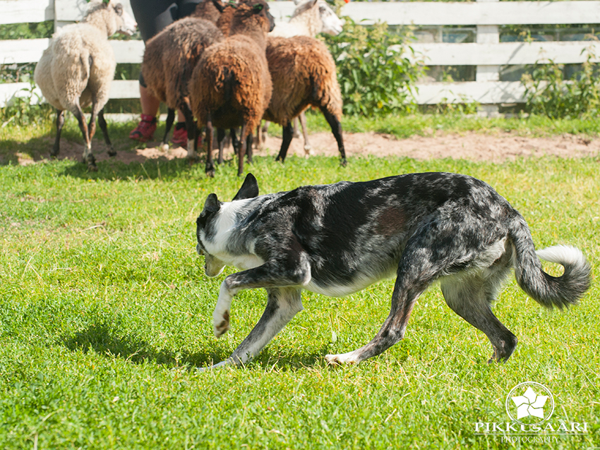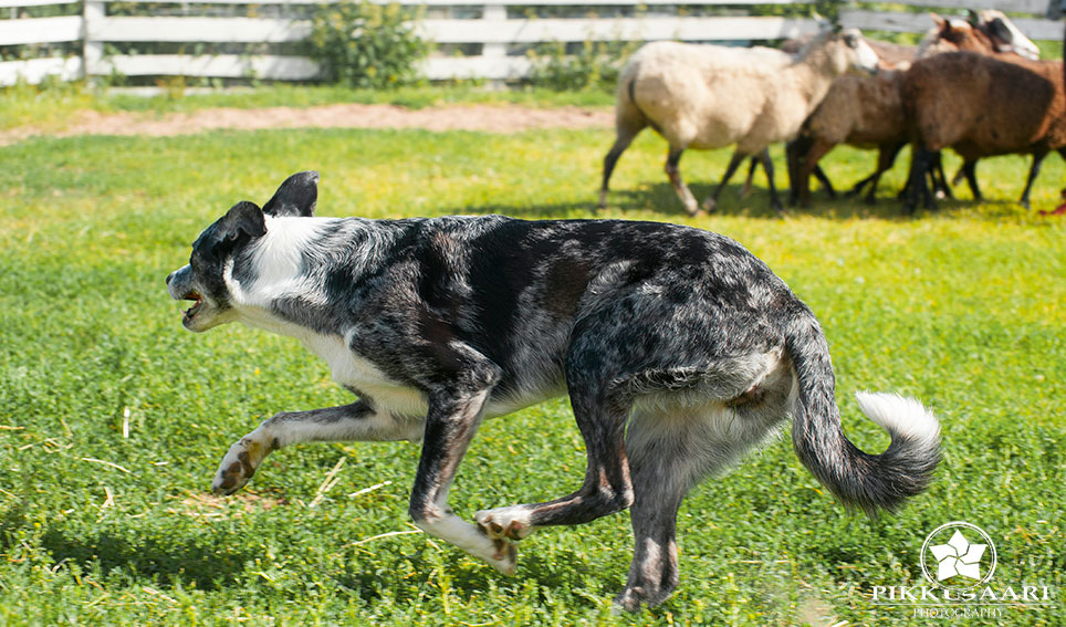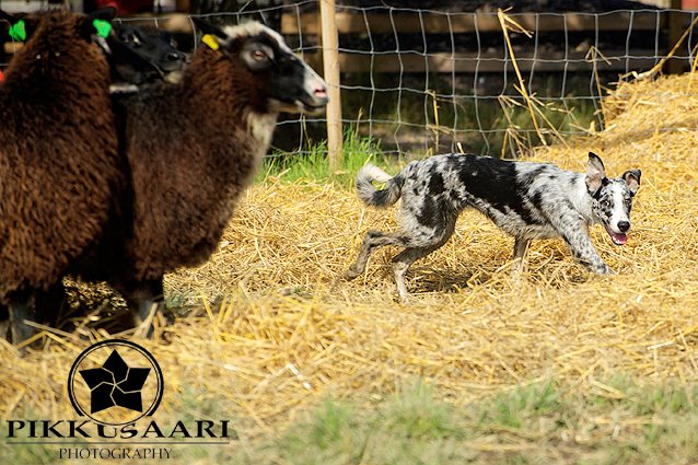 She can smell water from kilometers away and water jumping is her favourite thing! In herding she is focused, intence and reliable. She moves cattle guite easy and she has strong eye with sheep. Balances sheep nicely to me and drive is good. I can trust her to do the work.